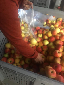 Het inpakken en verdelen van de zakken met appels gebeurt deze keer op de boerderij van Anton en Gerda Grotentraast.